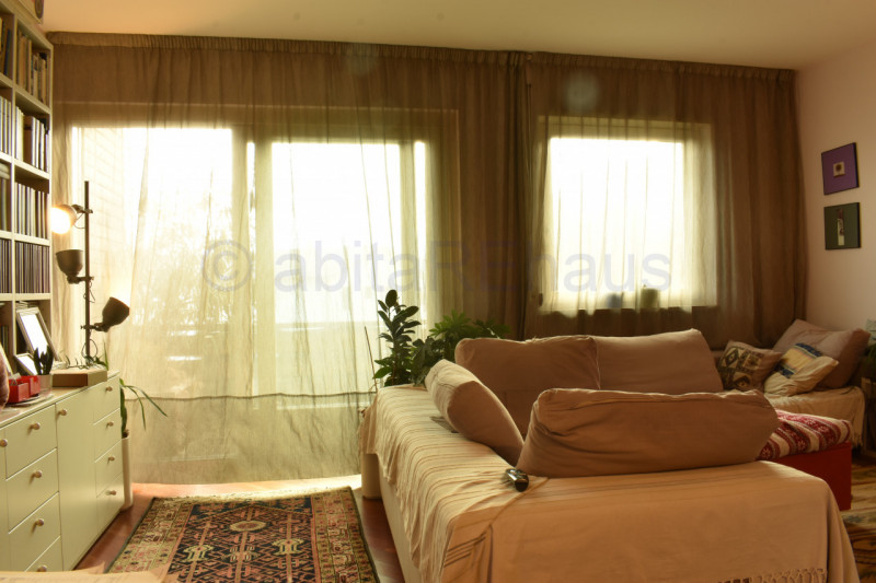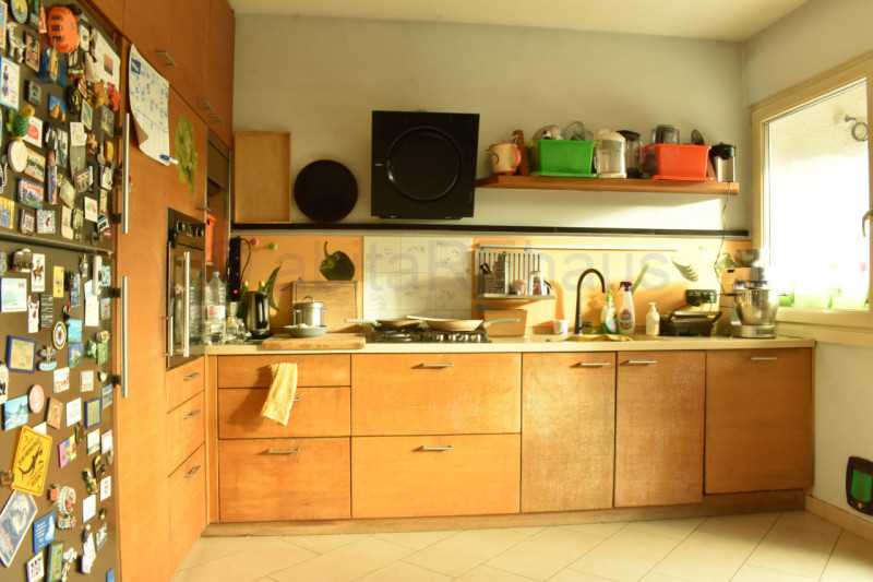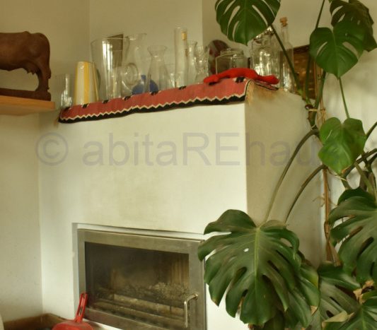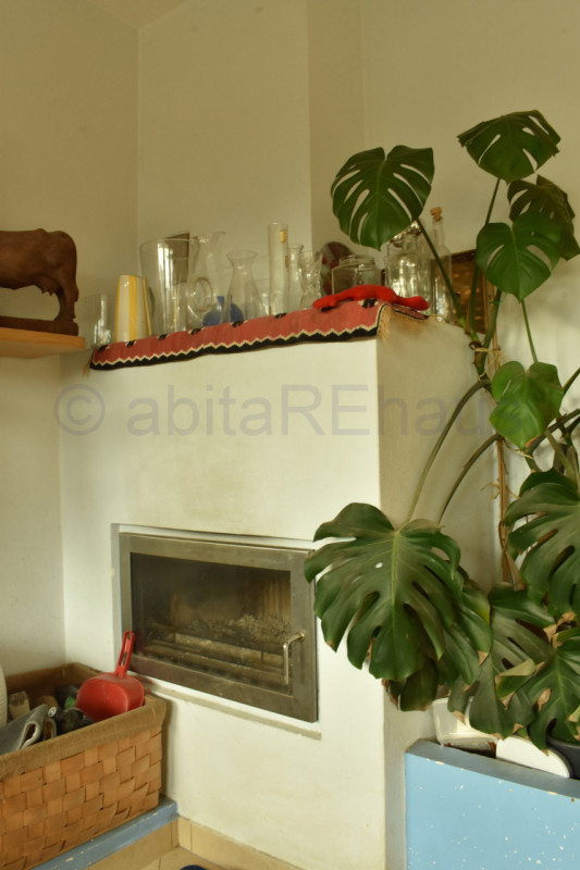 Das Haus bietet geräumige und helle Räume: Der Wohnbereich verfügt über eine gemütliche Wohnküche und ein Wohnzimmer mit großem maßgefertigten Bücherregal, einer Garderobe im Eingangsbereich und einem Badezimmer. Von hier aus führt eine Treppe in die oberen und unteren Stockwerke. Das Wohnzimmer und die Küche sind wie der Rest des Hauses mit Fußbodenheizung ausgestattet, aber auch mit einem Holzofen, der für eine warme Atmosphäre sorgt. Dank der großen Fenster nach Süden, die auf den grünen Privatgarten blicken, ist die Lichtdurchflutung maximal.
