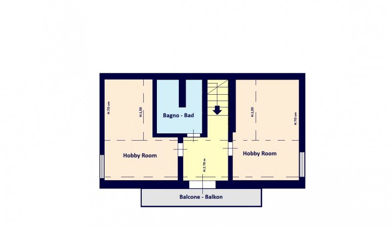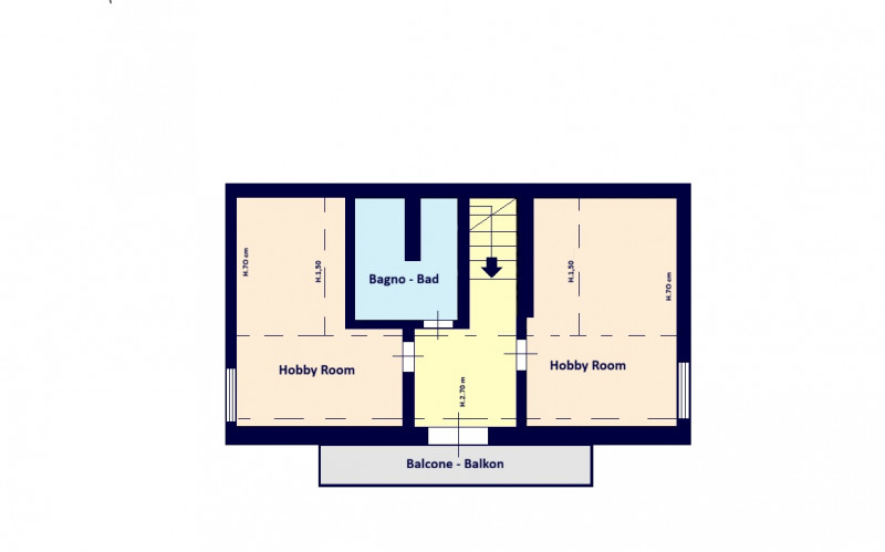 Al piano superiore troviamo una camera con bagno privato, una seconda camera con balcone a Sud – ora adibita a secondo living- e la scala di accesso al secondo piano dove si trovano due ulteriori ampie sale hobby ed un terzo bagno.